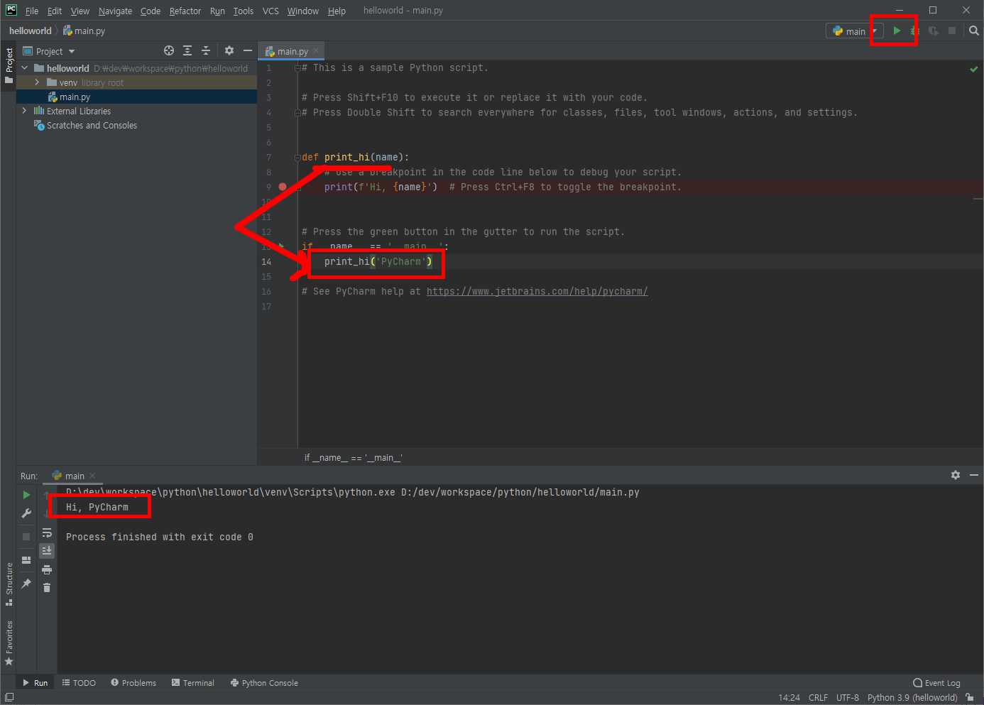 아래 소스에서는 if __name__ == '__main__' 안의 print_hi('pyCharm') 함수가 실행되고 'pyCharm'을 인수로 받은 print_hi(name) 함수는 'Hi, PyCharam' 을 print하게 됩니다.