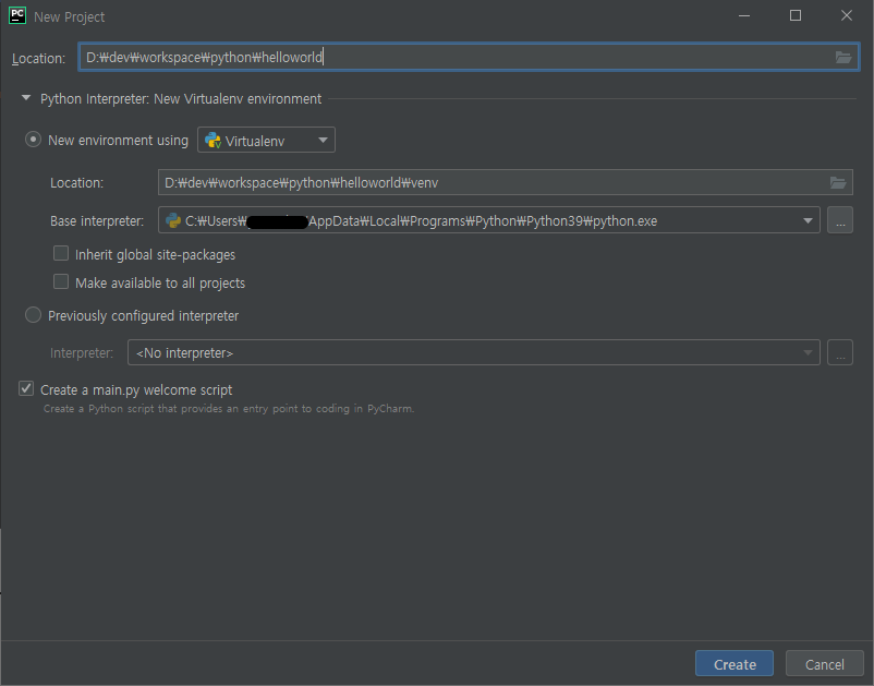 New Project를 생성합니다. 저는 helloworld 라고 이름을 정해보았습니다.