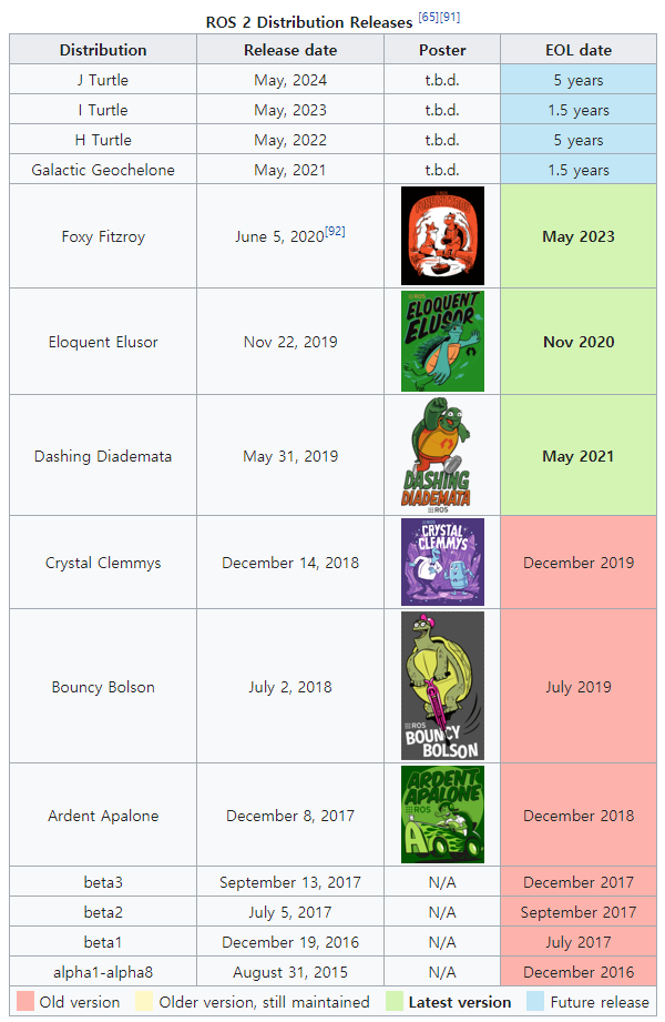최신의 LTS 버전인 F (Foxy Fitzroy) 버전은 2023년 5월까지만 공식 지원됩니다.